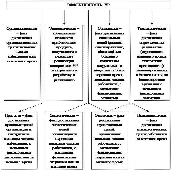 Эффективность УР – это ресурсная результативность, полученная по итогам разработки или реализации УР в организации. В качестве ресурсов выступают: финансы, материалы, организация персонала, здоровье персонала. Поэтому при принятии качественного решения эффект распространяется практически на все сферы деятельности организации, а его результат носит количественный характер, который отражается в документах предприятия.