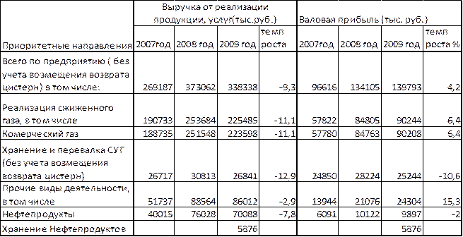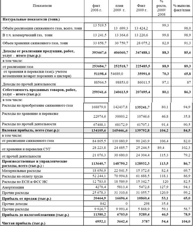 По итогам 2009 года выручка от реализации продукции, услуг уменьшилась по сравнению с 2008 годом на 34,7 млн. руб. или на 9,3 %, за счет снижения объемов реализации сжиженного газа в качестве моторного топлива на 596 тонн (на 33 млн. руб.), сокращения объемов хранения СУГ на 5784 тонн (на 4,0 млн .руб. ).