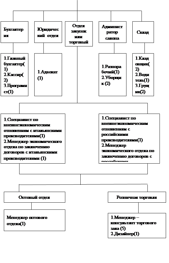 - Торговый отдел (оптовая и розничная торговля): включает в себя торг, договоры с поставщиками, установление цен;