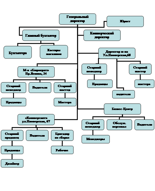 Во главе предприятия стоит генеральный директор, который определяет общую политику организации в целом (какой товар приобретать, какого объёма, утверждает розничную цену, общее руководство персоналом и т.д.).