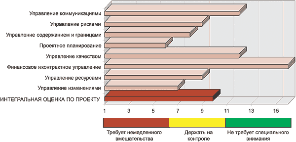 Отчет о статусе может содержать интегральные оценки по ключевым направлениям проектной деятельности, которые позволяют определить области управления проектом, негативно влияющие на ход выполнения работ. Пример такой интегральной оценки приведен на рис. 1.
