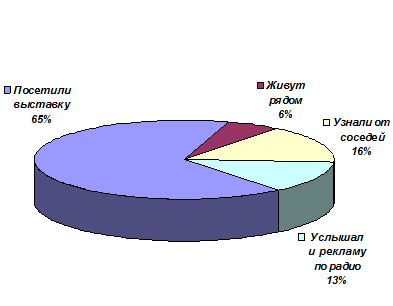 Остальные 35% поделились на тех, кто узнает о предприятии через рекламу по радио (16%), из рассказов соседей, узнавших о выставке (13%), и тех, кто просто живет рядом и зашел по пути (6%).