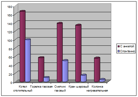 Из графиков видно, что мнение о том, что необходимо приобрести, значительно изменялось после того, как потребителям предлагалось несколько дополнительных вариантов. После того, как они видели в анкете, что могут приобрести что-то еще, они уже ставили не один крестик напротив того, за чем пришли, а принимали решение заказать и другое оборудование. Следует заметить, что за отопительным котлом пришло и так достаточно большое количество респондентов (50%), по этому даже после предоставления вариантов решение о покупке увеличилось незначительно, чего нельзя сказать о других видах газового оборудования. Так, например, изначально было принято 15 из возможных 200 решений о заказе шарового крана, а после предоставления анкеты – 134.