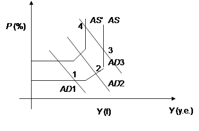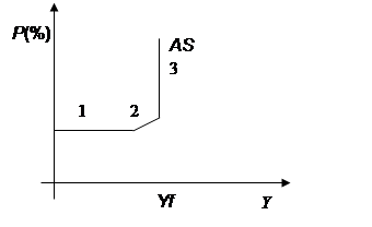 1- горизонтальный (кейнсианский) участок. Для него характерны спад, высокая безработица, но нет инфляции.
