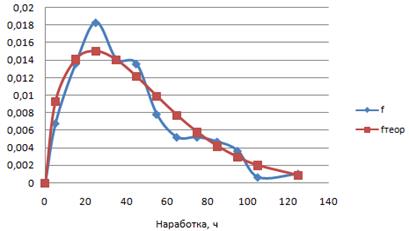 По данным статистического ряда и теоретического распределения строим графики статистических и теоретических функций показателя надежности. Дифференциальная функция f(t) наиболее наглядно отражает специфические черты закона распределения.