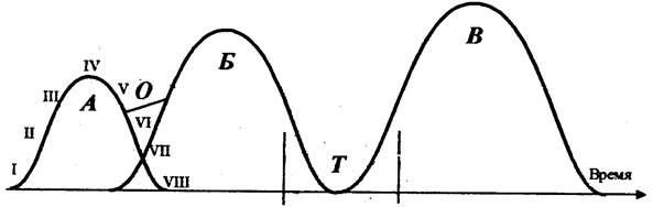 Рисунок 2 - Жизненный цикл предприятия, где А, Б, В – жизненные циклы деятельности предприятия