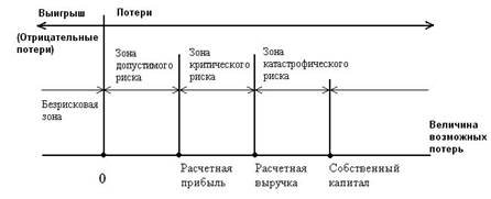 Экономические границы, пределы риска определяются, с одной стороны, тем, в какой мере готов предприниматель идти на риск, если ресурсы, которыми он располагает, соответствуют целям, задачам конкретного проекта либо развития предприятия в целом, позволяют осуществлять проект. К числу таких параметров, включающих границы риска, можно отнести устойчивость производства и реализации продукции, прибыльность бизнеса, платежеспособность, четкий учет. С другой стороны, хозяйственный руководитель идет на риск, если он считает, уверен, что надежно управляет наличными ресурсами, а именно: