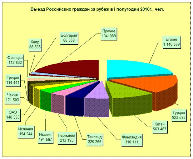 2010 год может стать рекордным по количеству российских туристов, выезжающих за рубеж. В 2008 году выездной туризм вырос на 21%. В прошлом году выездной туризм в России упал в среднем на 15% по сравнению с 2008 годом, а в нынешнем он растет на 20% по сравнению с 2009-м. При этом растет не только количество желающих выехать на отдых за рубеж, но и глубина продаж. Если в прошлом году туры покупали всего за неделю до поездки, то сейчас - заранее. На росте числа туристов в Европу сильно сказывается облегченная процедура выдачи виз в Испанию и Францию. Заявленное властями Греции и Италии облегчение в ближайшем будущем визового режима также повлияет на рост турпотока из России в эти страны.