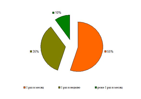 На данной диаграмме видно, что большинство респондентов пользуется автошампунем 1 раз в неделю, чуть меньшее число респондентов (35%) прибегают к мойке машины автошампунем 1 раз в месяц, 10% респондентов ответили, что пользуются авшампунем реже 1 раза в месяц.