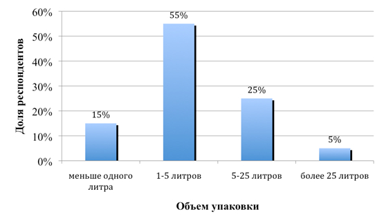 Из данного рисунка видно, что для опрошенных респондентов наиболее приемлемым объемом упаковки шампуня является 1- 5 литров (55%), 25% ответили, что для них приемлемым объемом является 5 – 25 литров, для 15% опрошенных – меньше одного литра, и всего 5% ответили, что для них приемлемым объемом являются упаковки более 25 литров.