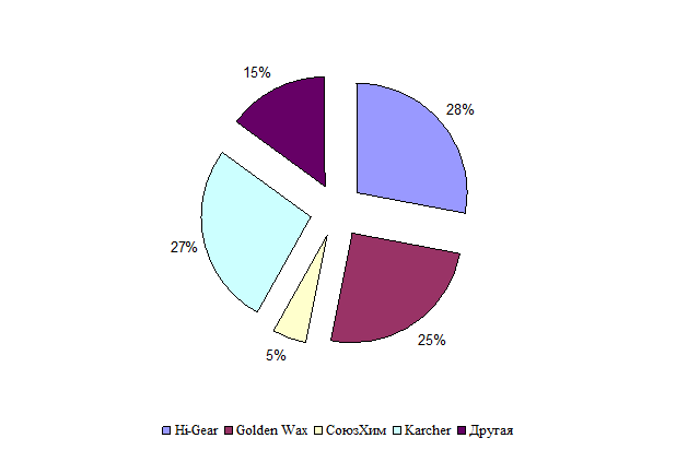 На диаграмме видно, что самой популярной маркой автошампуня в городе Владивостоке является автошампуни выпускаемые фирмой «Hi-Gear» ее выбрали 28% опрошенных. На втором месте марка «Karcher» 27%, затем 25% - автошампуни «Golden Wax», 15% предложили другую марку автошампуня , всего лишь 5% пользуются отечественными автошампунями выпускаемыми «СоюзХим».
