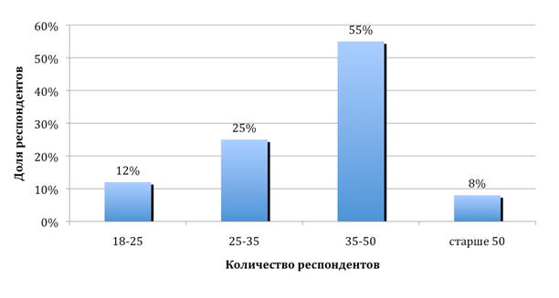 Из данной диаграммы видно, что 55% опрошенных, использующие автошампунь, люди в возрасте от 35 лет до 50 лет, 25% люди в возрасте от 25 до 35 лет, 12% люди в возрасте от 18 до 25 лет, и всего 68% опрошенных оказались люди в возрасте старше 50 лет.