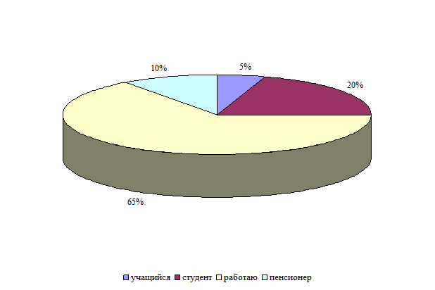 Из данной диаграммы видно, что 65% - наибольшая часть опрошенных, рабочие или служащие люди, 20% - студенты, 10% являются пенсионерами, 5 % являются учащиеся.