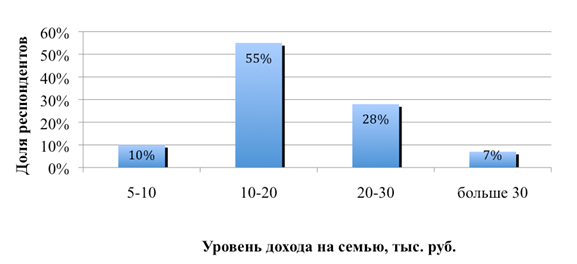Большинство респондентов (55%) составляют люди, ежемесячный доход которых составляет от 10000 – 20000 рублей на одного члена семьи, 28% составляют люди, ежемесячный доход которых от 20000 рублей до 30000 рублей на члена семьи, 10% - люди, ежемесячный доход которых равен 5000 – 10000, и 7% - респонденты, ежемесячный доход которых больше 30000 рублей.
