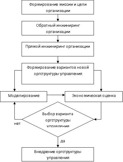 Образование подразделений по видам функций является наиболее широко распространенной формой группирования видов деятельности. Создание подразделений по видам продукции (услуг) имеет место в организациях, выпускающих несколько видов продукции или представляющих несколько видов услуг. Создание подразделений по видам процесса осуществляется в тех случаях, когда это дает возможность максимально использовать производственное оборудование и высококвалифицированные кадры. По территориальному признаку подразделения образуются в организациях, занимающих обширную территорию. Создание подразделений по потребителям происходит в случаях, когда работают с группами потребителей, которые разделены по признакам (возраст, пол, уровень доходов), имеющим существенное значение. По типу проектов подразделения создаются в тех случаях, когда формируются специализированные бригады (группы). Традиционный классический и частично поведенческий подходы к формированию организационной структуры управления предполагают осуществление следующей схемы работ [15]:
