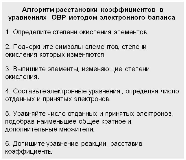 Мы рассмотрим только метод электронного баланса. Для этого используем алгоритм расстановки коэффициентов методом электронного баланса.