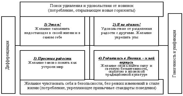 В этой матрице отразилось стремление современных японских потребителей к самовыражению через товары, подчеркивающие индивидуальность. Эпоха массовых товаров закончилась даже несмотря на то, что многие японцы все еще желают обладать тем же, что покупают другие, и стремятся за модными новинками. В первом сегменте производители продвигают товары, убеждая покупателей в следующем: