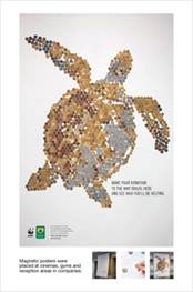 (рис.4) Реклама международной общественной организации, «WWF». Изображен трафарет черепахи, сложенный из прикрепленных монет на магнитный постер. Собирайте вместе с «WWF» и увидите, кому вы помогли. Это рекламное сообщение побуждает людей в виде «игры» заботиться о животных.