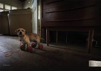 (рис.5) Реклама приюта для бездомных животных «RSPCA». Представлен в одиночестве домашний пёс. Вместо лап у него игрушечные колеса. Справа внизу присутствует надпись: «Животные - не игрушки. Так просто не заводите». Объект рекламы- это осознанное отношение к приобретенным животным . Каждый год тысячи домашних животных оказываются брошенными своими бывшими хозяевами. Реклама призывает людей больше и более серьезно думать перед тем, как решить завести себе домашнего питомца. Идея визуализирует выражение "Животные не игрушки", показывая, что их нельзя так просто выкинуть и забыть.