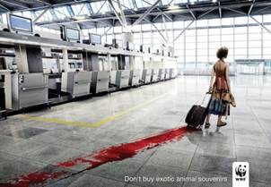 (рис.6) Реклама Всемирного фонда дикой природы «WWF». Надпись внизу рекламного плаката «Не стоит покупать экзотических животных, в качестве сувенира». На плакате изображена девушка, идущая в аэропорту, за которой остается кровавый след от ее чемодана. Покупая и привозя экзотических животных, люди не думают о их дальнейшем содержании, в котором привыкли жить звери, тем самым вы убивая и сокращая их численность на земле.