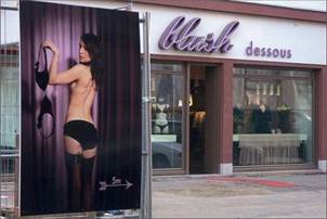 (рис.7) реклама магазина нижнего белья представлена в рекламных баннерах, расположенных в нескольких метрах друг от друга по направлению к рекламируемому бутику. По приближению к магазину «Blush dessous» изображенная на плакатах девушка раздевается, представляя тем самым товар в данном бутике. Таким образом, происходит повторение в пространстве в определенном ритме и по разным каналам восприятия.