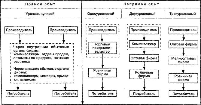 В зависимости от числа посредников в системе сбыта устанавливается уровень канала, в качестве которого могут выступать юридическая фирма или физическое лицо, выполняющие функции перемещения товара от производителя к потребителю. Число промежуточных уровней может характеризовать протяженность канала. Канал нулевого уровня, например, не включает посредника, так как производитель с помощью собственных внутренних или внешних образований передает товар непосредственно потребителям.