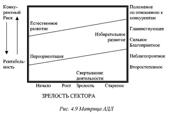 Оригинальным подходом к проблеме динамического анализа отличается матрица, предложенная Артуром Д.Литлом. Она имеет более сложную схему. А. Литл ввел в нее другие, чем в матрице БКГ, переменные: зрелость сектора и положение по отношению к конкурентам. Зрелость сектора отражает этапы изменения рынка, соответствующие стадиям ЖЦТ. Тем самым обеспечивается возможность анализа развития рынка во времени. Каждому этапу соответствуют определенные финансовые характеристики, специфические формы конкуренции, различные формы стратегического поведения. При определении положения в отношении конкурентов используются и показатели рыночной доли, и показатели конкурентоспособности, и интенсивность конкурентной борьбы.