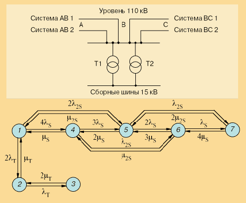 | Рис. 1 Структура и графы состояний опорной тяговой подстанции: 1- тяговая подстанция полностью работоспособна; 2- выход из строя одного из трансформаторов, подстанция в рабочем состоянии; 3- выход из строя обоих трансформаторов, подстанция в нерабочем состоянии; 4- выход из строя одной системы первичного электроснабжения, подстанция работоспособна; 5- выход из строя двух систем питания, подстанция в рабочем состоянии; 6- выход из строя трех систем питания, подстанция в рабочем состоянии; 7- выход из строя всех четырех систем питания, подстанция в нерабочем состоянии; l- продолжительность нахождения в нерабочем состоянии при отказе; m- то же, при выполнении работ по техническому обслуживанию; S- индекс, обозначающий систему первичного электроснабжения; T- индекс, обозначающий трансформатор тяговой подстанции