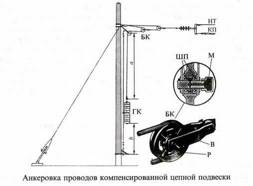 Блок компенсатора (БК) состоит из ролика (Р), укрепленного на вилке (В) и вращающегося в шариковых подшипниках (ШП). Смазка к подшипникам поступает через масленку (М), установленную на конце вала ролика. Трехблочные компенсаторы позволяют иметь вес груза, составляющий 25 % от натяжения, которое нужно создать в анкеруемых проводах. Грузы набирают из отдельных железобетонных элементов массой 25 кг каждый. Максимальные перемещения грузов при температурных изменениях не должны превышать расстояний а (между грузом и роликом) и в (между грузом и землей), величина которых определяется по специальным таблицам. Минимальная величина а и в обставляет 200 мм.