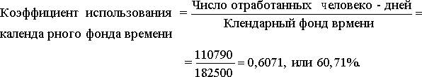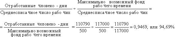б) путем деления числа фактически отработанных человеко-часов на максимально возможный фонд рабочего времени в человеко-часах. Последний можно получить, перемножив величину этого фонда в человеко-днях на среднюю установленную продолжительность рабочего дня:
