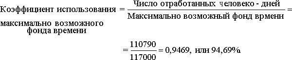 Коэффициент использования максимально возможного фонда рабочего времени характеризует степень фактического использования того времени, которое максимально могли отработать рабочие предприятия. Неиспользованное рабочее время на предприятии составило 5,31% (100%-94,69%). Это время, не отработанное по уважительным причинам (отпуска учебные и в связи с родами, дни болезни и неявок, разрешенных законом), а также потери рабочего времени (простои, неявки с разрешения администрации, прогулы).