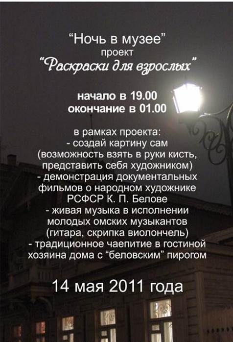 Здравствуйте, меня зовут Оксана! Я сегодня буду вашим модератором! Тема нашей фокус-группы будет посвящена музеям г. Омска. Первый вопрос, который я бы хотела задать : «Когда вы думаете о музеях города Омска, какое название вам первое приходит в голову.» Лия 21 год. – Музей имени Врубеля. Татьяна 23: Краеведческий музей, Анатолий 21- Достоевского, Ксения 23 – так же Врубеля. Модератор: А вы наверно в эти музеи часто посещали, Анатолий – да, я раньше их очень часто посещал. Модератор: Лия вы так же? Лия: да, конечно. Модератор: Понятно, а вообще вы ходите туда на специальные мероприятия, выставки? Вся фокус группа : Да. Анатолий : я хожу туда на постоянные выставки, которые там всегда есть. Вы наверно со времен школы начали ходить в музеи, или это был ваш собственный выбор? Анатолий: со времен школы я ходил, потому что надо было идти, а сейчас, потому что мне действительно интересно. Екатерина: а я посещаю выставки только тогда, когда проходят интересные мероприятия, т.е. например, привозят что то не обычное. Станислав: да, когда например, привозят, что то необычное, вот недавно во Врубеля ходил, там была выставка экзотических бабочек. Т.е. это больше выставка музея. Модератор: Посмотрите пожалуйста на фото и скажите, кому знаком этот человек? Почти вся группа сказала , что не известно, кроме Анатолия и Екатерины. – они сказали, что это Белов. У него очень классные усы, и запоминающая внешность. Антон: мне знаком Белов, потому что я по его картинам писал проект. Модератор: а вы именно по картинам самого Белова писали, а не по картинам его сыновей? Антон: да именно по его, просто мне очень нравится, этот омский художник, особенно его картина Деревня. Модератор: кому знакомо это здание. Вся фокус группа: Чекана Валиханова, это около Голубово огонька. Модератор: а кто ни будь из вас знает, что это музей К.П. Белова? Вся фокус-группа: да, мы знаем что это музей, но что музей именно Белова, мы не знали. Модератор: а вы бы хотели посетить его? Фокус-группа: да конечно!!! (хором). Модератор: Значит вызывает, бурный интерес. Из тех кто знает этот музей, кто ни будь его посещал. Фокус-группа – нет! (опять хором). Антон – а я посещал, т.к. писал о нем работу, как я уже говорил. Алена, а бы его посетила, если бы знала что там проходит, а то у входа, нет ни афиш, ни указателей. Нечего. Екатерина: совершенно согласна с Аленой, я его не посещала, ни потому что мне не интересно, а потому что я не знала, что там находится! Модератор: Понятно, значит на вопросы видели ли афиши музея, ответ понятен. Хорошо, я бы хотела вам сейчас продемонстрировать афиши музея, которые расклеены по городу, и узнать ваше мнение о их дизайне, что вам в них нравится, и что вы бы хотели поменять. Первая афиша «Графическая импровизация с 15 апреля 2011 года». Анатолий: мне кажется эта афиши очень не добросовестно выполнена. Имя Расхата Нуриева, занимает центрально место и выделено красным, для людей кто его знает, это что то говорит, а для меня нет. Мне бы понравилось, и я бы пошел на эту выставку если бы обратил внимание именно на название «Графические импровизации», а как мы видим название написано мелко, и не заметно, так же хочу обратить внимание на то что музей К.П. Белова, где будет происходить эта выставка вообще незаметно упомянут на афиши. Лия: эту афишу, необходимо откорректировать, чтобы на нее обращали больше внимания! Модера
