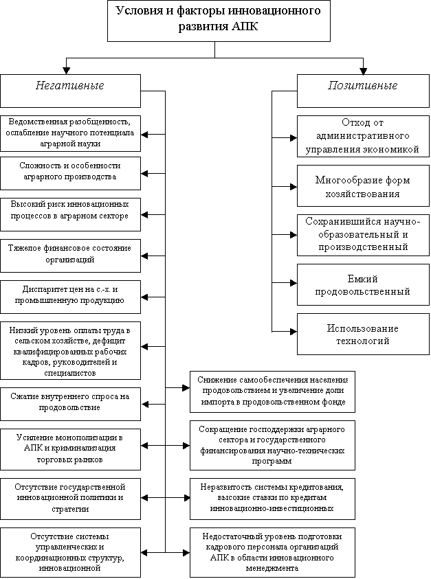 К условиям и факторам, тормозящим освоение инноваций в АПК, относятся также сжатие внутреннего спроса на продовольствие, сокращение господдержки аграрного сектора и государственного финансирования научно-технических программ, неразвитость системы кредитования, высокие ставки по кредитам, отсутствие инновационной инфраструктуры и государственной инновационной политики и стратегии, недостаточный уровень подготовки кадрового персонала организаций АПК в области инновационного менеджмента.