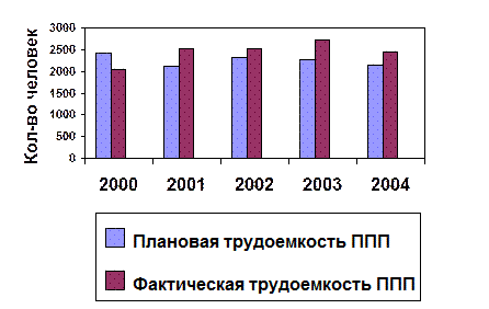 1. Проанализирована динамика численности персонала и трудоемкости процессов по добыче угля за 2000-2004 г.г. В результате анализа выявлено, что на трудоемкость работ влияют такие факторы как среднесуточная добыча и численность персонала, и что для снижения трудоемкости необходимо разработать мероприятия по росту добычи и численности.