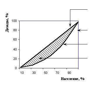 Для наглядной характеристики распределения доходов населения применяется график, так называемая «кривая Лоренца». График строится следующим образом. По оси абсцисс указывается доля населения в процентах, а на оси ординат – доля доходов так же в процентах.