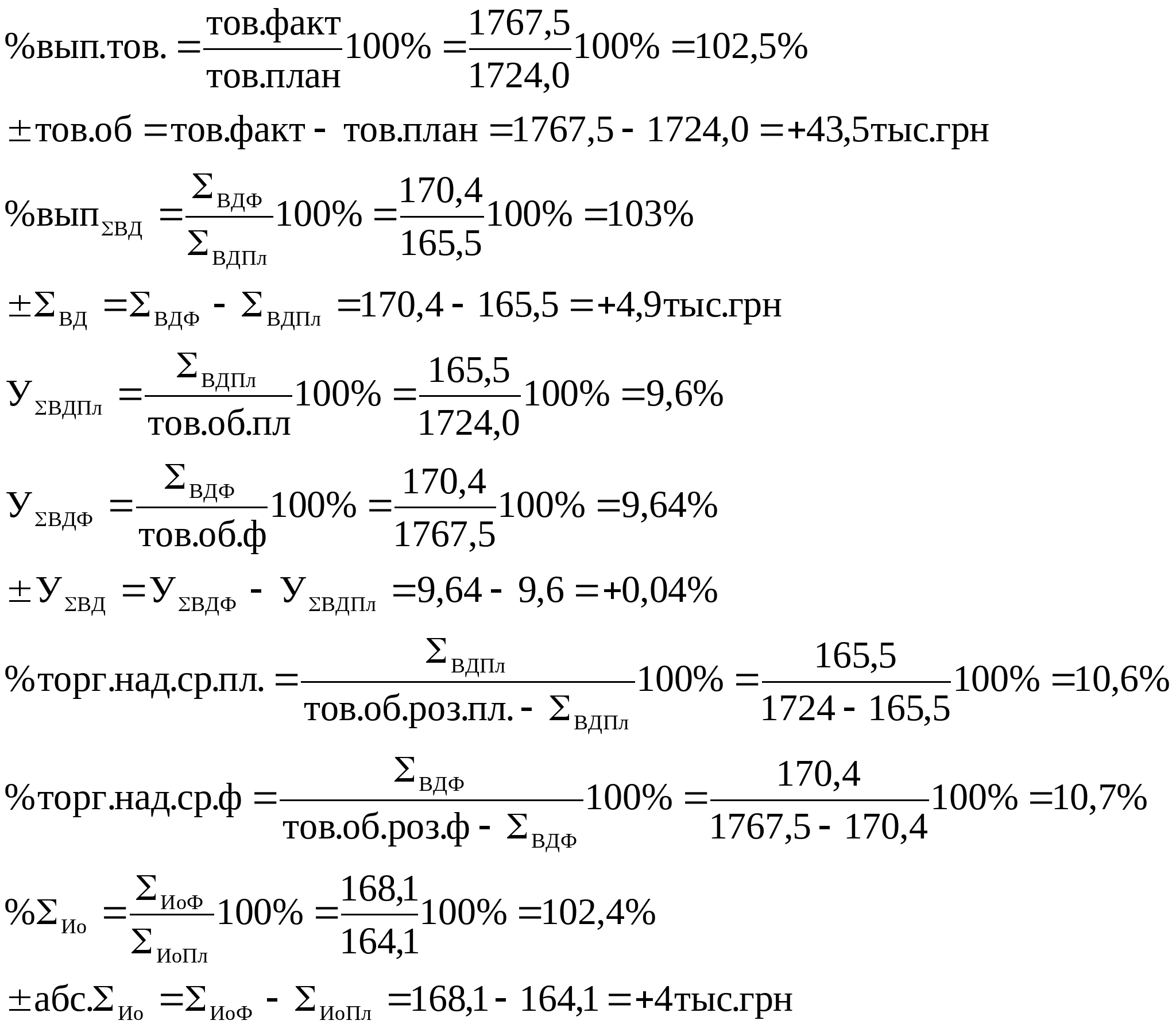 Экономический анализ хозяйственной деятельности предприятия №307 за 9 месяцев 1999 г. | Показатели | Ед. изм | План | Факт | % выполнения | отклонение | | Товарооборот | т.грн | 1390,0 | 1404,6 | 101,1 | +14,6 | | Валовый доход | т.грн | 132,4 | 137,7 | 104 | +5,3 | | Сумма издержек обращения | т.грн | 123,1 | 127,1 | 103 | +4 | | % торговой надбавки ср.факт | % | 10,5 | 10,9 | - | - | | Уровень суммы валового дохода | % | 9,52 | 9,80 | - | +0,28 | | Уровень суммы издержек обращения | % | 8,8 | 9 | - | +0,2 | | Прибыль | т.грн | 9,3 | 10,6 | 114 | +1,3 | | Рентабельность | % | 0,66 | 0,75 | - | - |