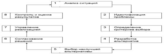 — это циклическая последовательность действий субъекта управления, направленных на разрешение проблем организации и заключающихся в анализе ситуации, генерации альтернатив, принятии решения и организации его выполнения. Наиболее целостное и наглядное преставление о процессе принятия решений (ППР) дает схема, отражающая его основные стадии и порядок их следования. Такая схема представлена на рис.3.
