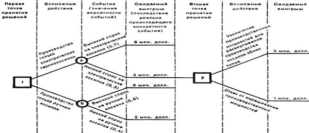 Метод дерева решений может применяться как в ситуациях, в которых применяется платежная матрица, так и в более сложных ситуациях, в которых результаты одного решения влияют на последующие решения. То есть дерево решений – удобный метод для принятия последовательных решений. На рис. 4 проиллюстрировано применение метода дерева решений для разрешения проблемы, требующей определенной последовательности решений.