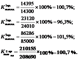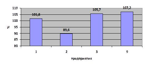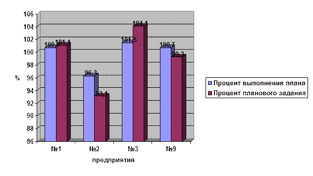 При анализе абсолютных и относительных величин было выявлено, что более высокий процент перевыполнения плана по выпуску продукции приходится на предприятие №3 – 101,5%. Менее всего был перевыполнен план на предприятии №1 и №9 – на 0,7% (100,7-100). На предприятии №2 план по выпуску продукции был не выполнен – 96,3%. А более высокий процент установления планового задания приходится на предприятие №3 – 104,1%, в то время как на предприятие №1– 101,1%, №2 – 93,1%, №9 – 99,3%.
