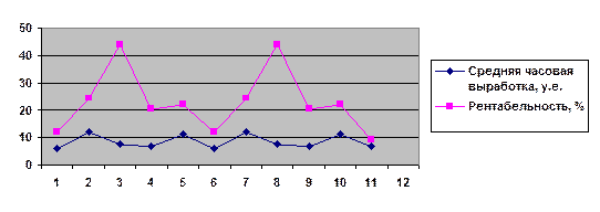 При корреляционном анализе влияния производительности труда на динамику рентабельности предприятия было выявлено, что с увеличением средней часовой выработки рабочего на 1 тысячу рублей рентабельность предприятия в среднем возрастает на 0,89. С увеличением средней часовой выработки рабочего на 1% приводит к увеличению рентабельности предприятия на 0,356%.
