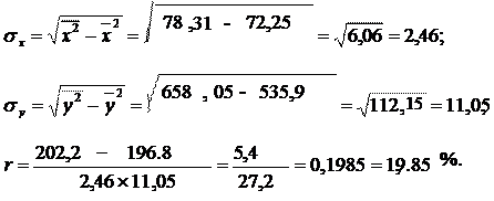Рассчитаем величину линейного коэффициента корреляции для установления тесноты связи между производительностью труда и рентабельностью предприятия: