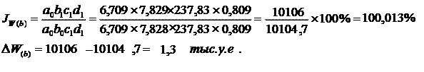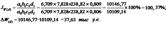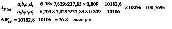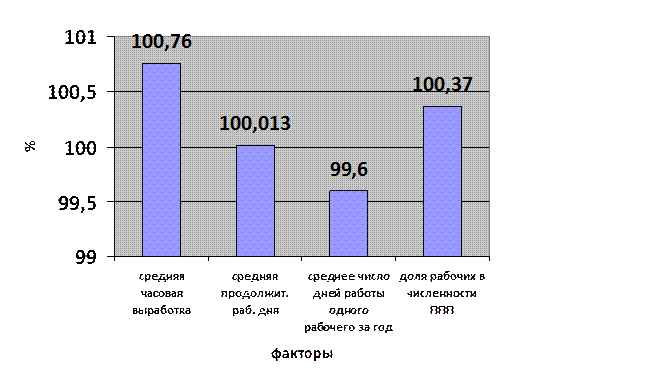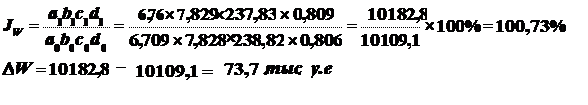 Так, в результате проведенного анализа был сделан вывод, что средняя годовая выработка работника в отчетном периоде по сравнению с базисным повысилась на 0,73% (100,73%-100%), или на 73,7 тыс. у.е., в том числе: