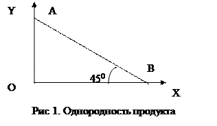 В терминах теории полезности однородность продукта означает, что продукты разных производителей полностью взаимозаменяемы для каждого покупателя, причем предельная норма замещения одного продукта другим равна единице. Например, замена в наборе апельсина одного производителя на апельсин другого производителя не изменяет полезности набора. В этом случае каждая кривая безразличия покупателя представляет собой отрезок прямой, наклоненный к осям координат под углом 450