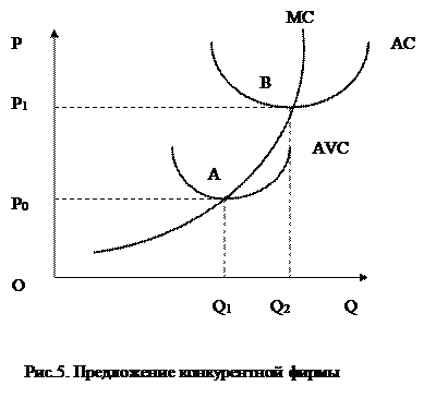 Итак, кривая предложения конкурентной фирмы представляет собой ветвь кривой предельных издержек, которая лежит выше минимума средних переменных издержек. Кривая предложения конкурентной фирмы изображена на рис.5. При выпуске Q1