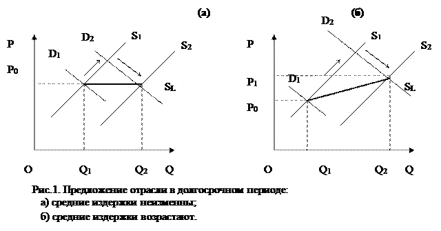 На рис.1 долгосрочная кривая предложения отрасли с неизменными издержками изображена жирной линией и обозначена SL