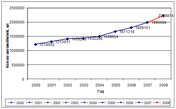 За семь лет прирост числа автомобилей составил 771.514 шт., т.е. в среднем парк автомобилей увеличивается на 9% в год. При этом следует отметить, что рост числа автомобилей идет нарастающими темпами, т.е. если за 2005 г. парк автомобилей вырос на 4,7%, то за 2008 г. этот рост составил 10%. На основе этого можно предположить, что за 2009 г. рост парка автомобилей составит около 12%.