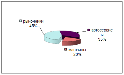 Сфера деятельности потребителя: 45% покупателей работают на рынках, 35% - это автосервисы; а 20% - специализированные магазины, что показано на рис. 2.