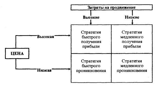 Она может установить верхний или нижний уровень для каждой из маркетинговых переменных - цены, продвижения, распространения и качества товара. Принимая во внимание только цену и стимулирование, стратегия проникновения на рынок может быть конкретизирована с помощью матрицы «цена товара - затраты на продвижение» (рис.1) :