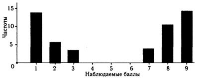 В том случае, когда распределение данных бимодально (имеет две моды), необходимо говорить об эксцессе в окрестности каждой моды. Бимодальная конфигурация указывает на то, что по результатам выполнения теста выборка учеников разделилась на две группы. Одна группа справилась с большинством легких, а другая с большинством трудных заданий теста. Один из наиболее важных выводов в случае бимодального распределения нацелен на коррекцию трудности заданий теста. По-видимому, в тесте недостаточно представлены задания средней трудности, позволяющие выровнять распределение баллов, приблизив его к нормальной кривой.