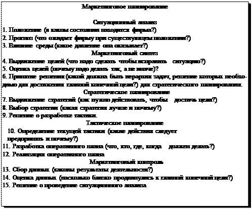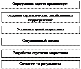 Процесс стратегического планирования состоит из семи взаимосвязанных этапов; осуществляется совместно руководством фирмы и сотрудниками маркетинговых служб.